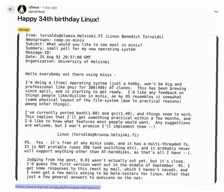 1991年,Linus 21岁,在芬兰,写了第一版帖子。